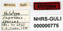 ![]() Capaneus spurcus Stål, 1862. Reference: Stål, C. 1862, Hemiptera mexicana enumeravit speciesque novas descripsit - Entomologische Zeitung entomologischen Vereine zu Stettin, 23 Jahrgang, No: 7-9, pp. 291-292. Return to species-list. |