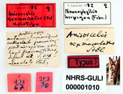 ![]() Anisoscelis sexmaculata Stål, 1860. syn to Nannophyllia harpagon Fabricius, 1775 Reference: Stål, C. 1860, Till kännedomen om Coreida - Öfversigt af Kongliga Vetenskaps-Akademiens förhandlingar sextonde årgången, No. 9, p. 458. Return to species-list. |