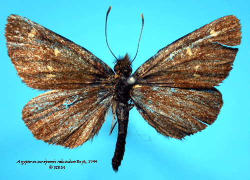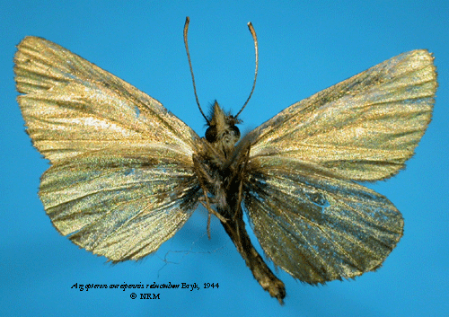 ![]() Argopteron aureipennis reductulum Bryk, 1944. Reference: Bryk, F. 1944, Über die Schmetterlingsausbeute der Schwedischen wissenschaftlichen Expedition nach Patagonien 1932/1934. Report Number 11 from the Ljungner Expedition 1932/1934. Mit 2 Tafeln. - Arkiv för Zoologi Band 36 A nr. 3, Almqvist & Wiksell Boktryckeri, Uppsala. 1 - 30 pp. Return to species-list. |