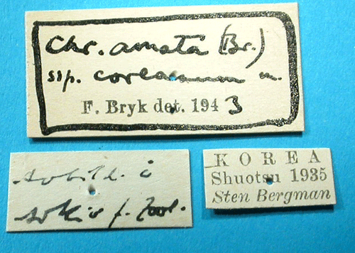 ![]() Chrysorithrum amatum amorina Bryk, 1948. Reference: Bryk, F. 1948, Zur Kenntnis der Großschmetterlinge von Korea. Pars II. Macrofrenatae II (finis): Notodontidae, Lymantriidae, Saturniidae, Brahmaeidae, Drepanidae, Epiplemidae, Lasiocampidae, Arctiidae, Thyatiridae, Noctuidae, Geometridae. Heteroneura: Fam.: Cochlifiidae, Zygaenidae. Tineoidea: Fam.: Cossidae, Psychidae. Mit 7 Tafeln. - Arkiv för Zoologi Band 41 A nr. 1, Almqvist & Wiksell Boktryckeri, Uppsala. 1 - 225 pp. Return to species-list. |