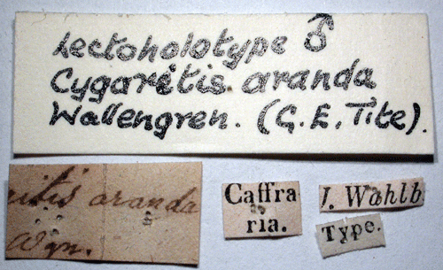Reference: Wallengren, H.D.J. 1857, Kafferlandets Dagfjärilar, insamlade åren 1838-1845 af J. A. Wahlberg. - Kongliga Vatenskaps-Akademiens Handllingar, ny följd, andra bandet fjärde häftet. pp 1-55, P. A. Norstedt & Söner, Stockholm.