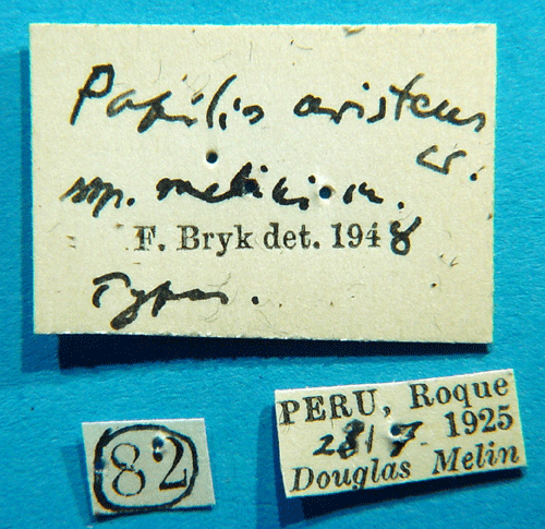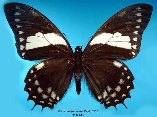 ![]() Papilio aristeus melini Bryk, 1953. Reference: Bryk, F. 1953, Lepidoptera aus dem Amazonasgebiete und aus Peru gesammelt von Dr. Douglas Melin und Dr. Abraham Roman. - Arkiv för Zoologi Band 5 nr. 1, Almqvist & Wiksell Boktryckeri, Uppsala. 268 pp. Return to species-list. |