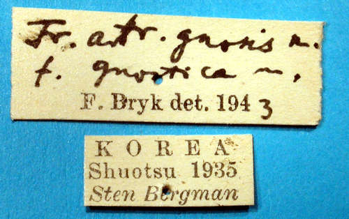 Reference: Bryk, F. 1948, Zur Kenntnis der Großschmetterlinge von Korea. Pars II. Macrofrenatae II (finis): Notodontidae, Lymantriidae, Saturniidae, Brahmaeidae, Drepanidae, Epiplemidae, Lasiocampidae, Arctiidae, Thyatiridae, Noctuidae, Geometridae. Heteroneura: Fam.: Cochlifiidae, Zygaenidae. Tineoidea: Fam.: Cossidae, Psychidae. Mit 7 Tafeln. - Arkiv för Zoologi Band 41 A nr. 1, Almqvist & Wiksell Boktryckeri, Uppsala. 1 - 225 pp.