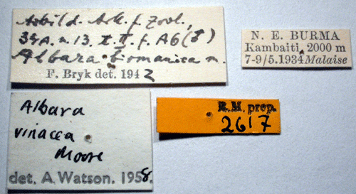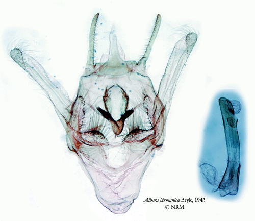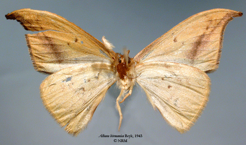 ![]() Albara birmanica Bryk, 1943. Reference: Bryk, F. 1943, Entomological Results from the Swedish Expedition 1934 to Burma and British India. Lepidoptera: Drepanidae. - Arkiv för Zoologi Band 34 A nr. 13, Almqvist & Wiksell Boktryckeri, Stockholm. pp. 1 - 30, Mit 1 Karte und 3 Tafeln. Return to species-list. |