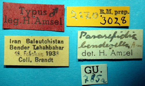 Parasefidia benderella Amsel, 1950. Reference: Amsel, H.G. 1950, Die Microlepidopteren der Brandt'schen Iran-Ausbeute 2. Teil. - Arkiv för Zoologi Band 1 A nr. 17, Almqvist & Wiksells Boktryckeri AB, Uppsala. pp. 223-257 Mit 84 Figuren im Text. Return to species-list. |