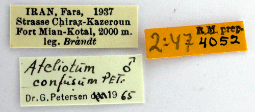 Ateliotum confusum Petersen, 1966. Reference: Petersen, G. 1966, Die Microlepidopteren der Brandt'schen Iran-Ausbeute 6. Teil. - Entomologisk tidskrift Årgång 87, H. 1-2, Lund, pp. 23-29 Mit 4 Fig. Return to species-list. |