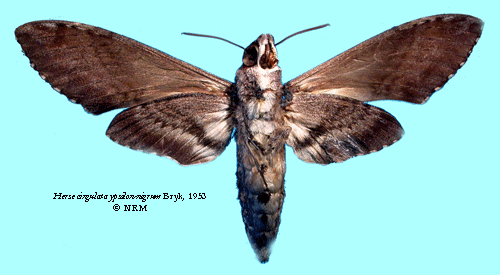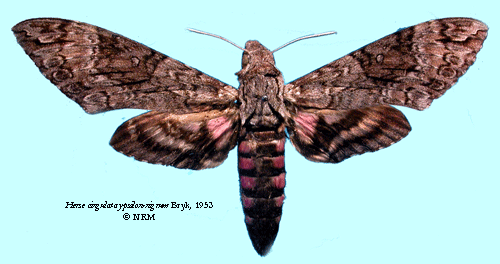 ![]() Herse cingulata ypsilon-nigrum Bryk, 1953. Reference: Bryk, F. 1953, Lepidoptera aus dem Amazonasgebiete und aus Peru gesammelt von Dr. Douglas Melin und Dr. Abraham Roman. - Arkiv för Zoologi Band 5 nr. 1, Almqvist & Wiksell Boktryckeri, Uppsala. 268 pp. Return to species-list. |