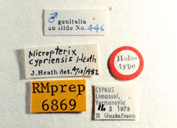 Micropterix cypriensis Heath, 1985. Reference: Heath, J. 1985, New species of Micropterix Hübner (Lepidoptera, Zeugloptera : Micropterigidae) from Greece and Cyprus. - Nota lepid. 8 (4) pp. 336-340. Return to species-list. |