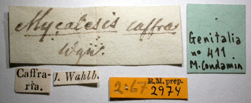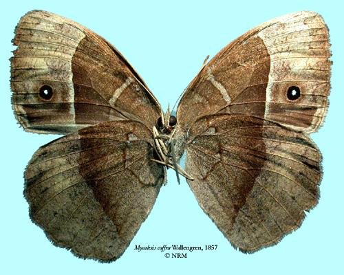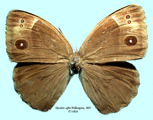 ![]() Mycalesis caffra Wallengren, 1857. Reference: Wallengren, H.D.J. 1857, Kafferlandets Dagfjärilar, insamlade åren 1838-1845 af J. A. Wahlberg. - Kongliga Vatenskaps-Akademiens Handllingar, ny följd, andra bandet fjärde häftet. pp 1-55, P. A. Norstedt & Söner, Stockholm. Return to species-list. |