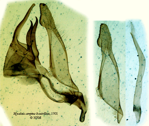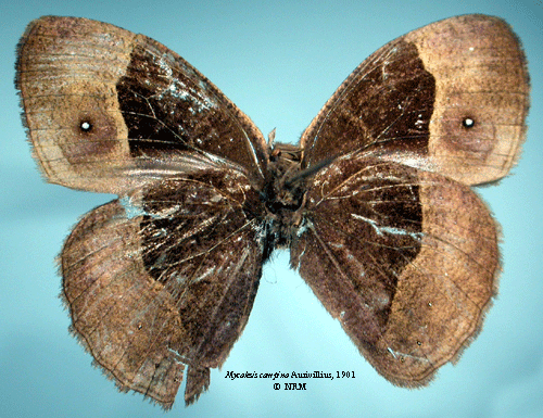Mycalesis campina Aurivillius, 1901. Reference: Aurivillius, C. 1901, Diagnosen neuer Lepidopteren aus Afrika 6. - Entomologisk tidskrift vol 22, Iduns Kongl. Hofboktryckeri, Stockholm. pp. 113-128. Return to species-list. |