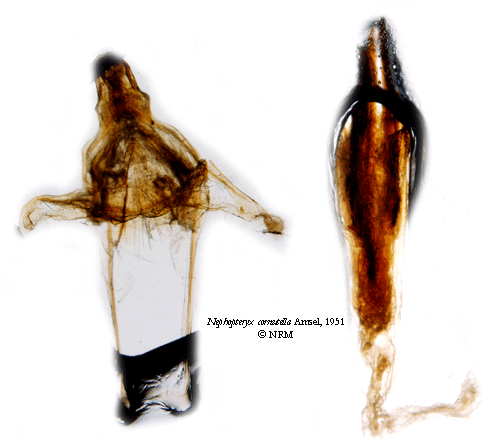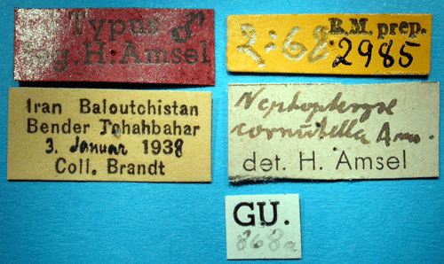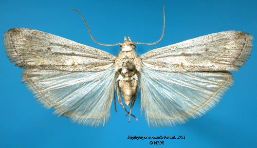 Nephopteryx cornutella Amsel, 1951. Reference: Amsel, H.G. 1951, Die Microlepidopteren der Brandt'schen Iran-Ausbeute 3. Teil. - Arkiv för Zoologi Band 1 nr. 36, Almqvist & Wiksells Boktryckeri AB, Uppsala. pp. 525-563 Mit 87 Figuren im Text. Return to species-list. |