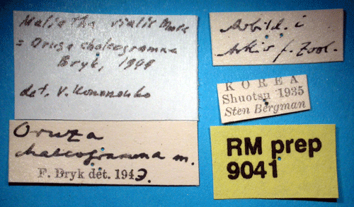 Reference: Bryk, F. 1948, Zur Kenntnis der Großschmetterlinge von Korea. Pars II. Macrofrenatae II (finis): Notodontidae, Lymantriidae, Saturniidae, Brahmaeidae, Drepanidae, Epiplemidae, Lasiocampidae, Arctiidae, Thyatiridae, Noctuidae, Geometridae. Heteroneura: Fam.: Cochlifiidae, Zygaenidae. Tineoidea: Fam.: Cossidae, Psychidae. Mit 7 Tafeln. - Arkiv för Zoologi Band 41 A nr. 1, Almqvist & Wiksell Boktryckeri, Uppsala. 1 - 225 pp.