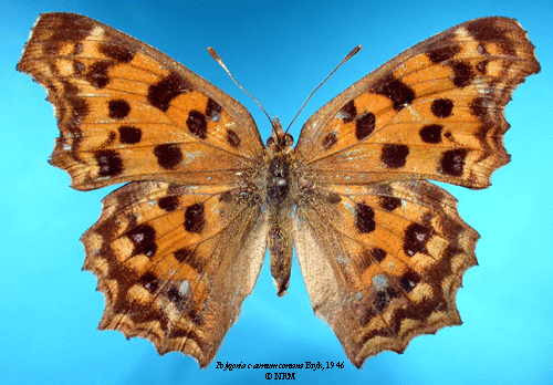 ![]() Polygonia c-aureum coreana Bryk, 1946. Reference: Bryk, F. 1946, Zur Kenntnis der Großschmetterlinge von Korea. Pars I. Rhopalocera, Hesperiodea et Macrofrenatae I Sphingidae. Mit 5 Tafeln und 1 Karte. - Arkiv för Zoologi Band 38 A nr. 3, Almqvist & Wiksell Boktryckeri, Uppsala. 1 - 74 pp. Return to species-list. |