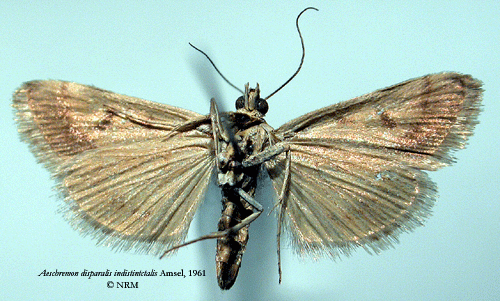 Aeschremon disparalis indistinctalis Amsel, 1961. Reference: Amsel, H.G. 1961, Die Microlepidopteren der Brandt'schen Iran-Ausbeute 5. Teil. - Arkiv för Zoologi Band 13 nr. 17, Almqvist & Wiksells Boktryckeri AB, Uppsala. pp. 323-445 Mit 263 Abbildungen. Return to species-list. |