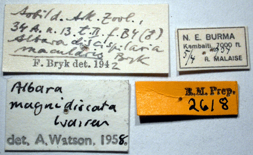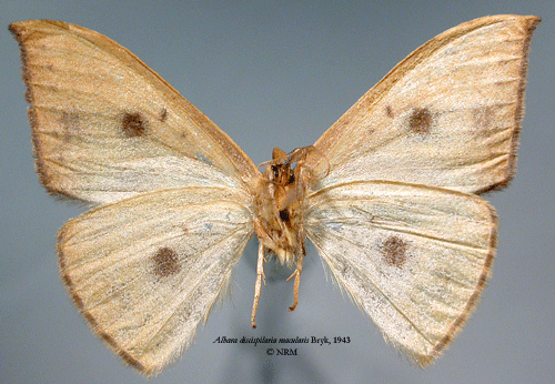 ![]() Albara discispilaria macularis Bryk, 1943. Reference: Bryk, F. 1943, Entomological Results from the Swedish Expedition 1934 to Burma and British India. Lepidoptera: Drepanidae. - Arkiv för Zoologi Band 34 A nr. 13, Almqvist & Wiksell Boktryckeri, Stockholm. pp. 1 - 30, Mit 1 Karte und 3 Tafeln. Return to species-list. |