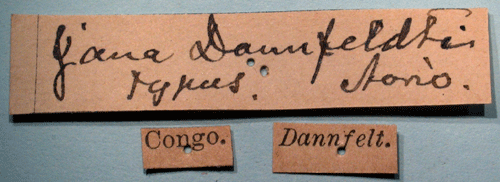 Jana dannfelti Aurivillius, 1893. Reference: Aurivillius, C. 1893, Diagnosen neuer Lepidopteren aus Afrika. - Entomologisk tidskrift vol 14, Iduns Kongl. Hofboktryckeri, Stockholm. pp. 199-214. Return to species-list. |