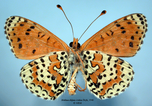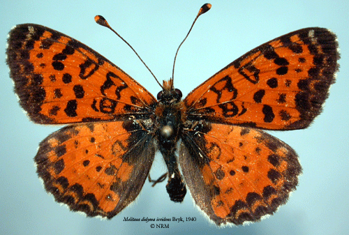 ![]() Melitaea didyma irridens Bryk, 1940. Reference: Bryk, F. 1940, Geographische Variabilität von Melitaea didyma (Esper) (mit 59 Abbildungen auf 6 Tafeln). - Folia Zoologica et Hydrobiologica Vol. X No: 2, Riga. pp. 293-353. Return to species-list. |