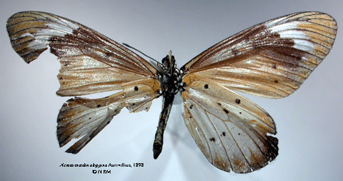 ![]() Acraea encedon alcippina Aurivillius, 1898. Reference: Aurivillius, Chr. 1898, Kongliga Svenska Vetenskaps-Akademiens Handlingar, ny följd, Band 31 no: 5. - Rhophalocera Aethiopica, Die Tagfalter des Aethiopischen Faunengebietes, Eine Systematisch-Geographische studie p. 111, P.A. Norstedt & Söner, Stockholm. Return to species-list. |