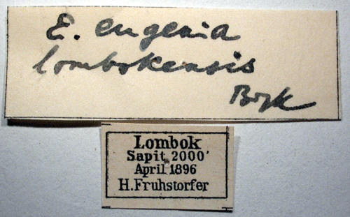 ![]() Euchera eugenia lombokensis Bryk, 1941. Reference: Bryk, F. 1941, Neue Schmetterlinge aus dem Reichsmuseum in Stockholm. - Entomologisk tidskrift vol 62 H. 3-4, Almqvist & Wiksell Boktryckeri, Uppsala. 141 - 157 pp. Mit 6 Abb. Return to species-list. |