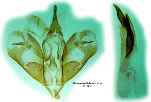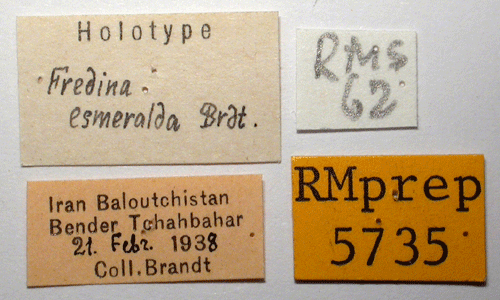 Fredina esmeralda Brandt, 1939. Reference: Brandt, W. 1939, Beitrag zur Lepidopteren-Fauna von Iran. Einige neue Agrotiden aus Laristan und Baloutchistan. - Entomologische Rundschau Jahrgang 56, Stuttgart. p. 242. Return to species-list. |