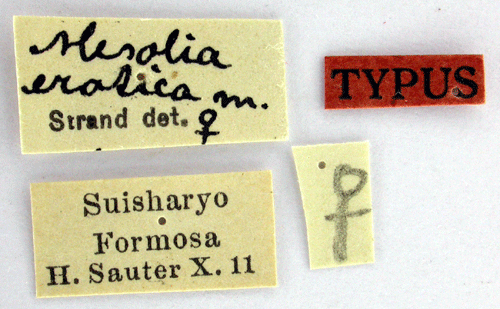 Mesolia erotica Strand, 1918. Reference: Strand, E. 1918, H. Sauter's Formosa-Ausbeute: Pyralididae, Subfam. Galleriinae, Crambinae, Schoenobiinae, Anerastiinae und Phycitinae. - Stettiner Entomologische Zeitung Jahrgang 79, Stettin. pp. 248-276. Return to species-list. |