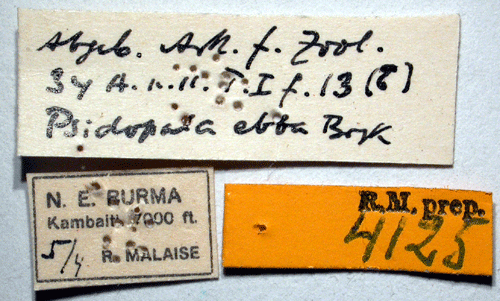 ![]() Psidopala ebba Bryk, 1942. Reference: Bryk, F. 1942, Entomological Results from the Swedish Expedition 1934 to Burma and British India. Lepidoptera: Thyatiridae. - Arkiv för Zoologi Band 34 A nr. 11, Almqvist & Wiksell Boktryckeri, Stockholm. pp. 1 - 16, Mit 1 Karte und 2 Tafeln. Return to species-list. |