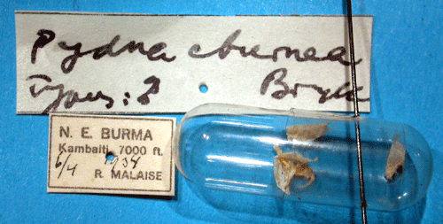![]() Pydna eburnea Bryk, 1949. Reference: Bryk, F. 1949, Entomological Results from the Swedish Expedition 1934 to Burma and British India. Lepidoptera: Notodontidae Stephens, Cossidae Newman and Hepialidae Stephens. Gesammelt von René Malaise. Mit 4 Tafeln und 1 Karte in Text. - Arkiv för Zoologi Band 42 A nr. 19, Almqvist & Wiksell Boktryckeri, Uppsala. 1 - 51 pp. Return to species-list. |