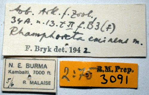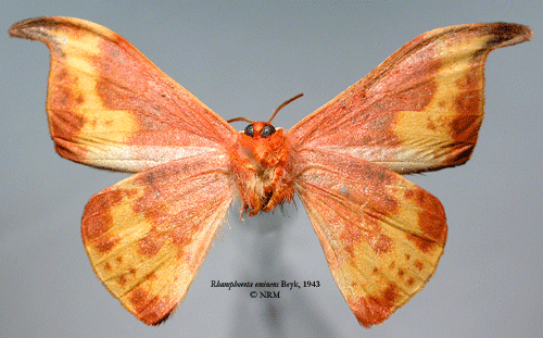 ![]() Rhamphoreta eminens Bryk, 1943. Reference: Bryk, F. 1943, Entomological Results from the Swedish Expedition 1934 to Burma and British India. Lepidoptera: Drepanidae. - Arkiv för Zoologi Band 34 A nr. 13, Almqvist & Wiksell Boktryckeri, Stockholm. pp. 1 - 30, Mit 1 Karte und 3 Tafeln. Return to species-list. |