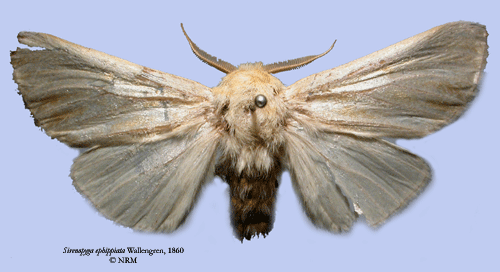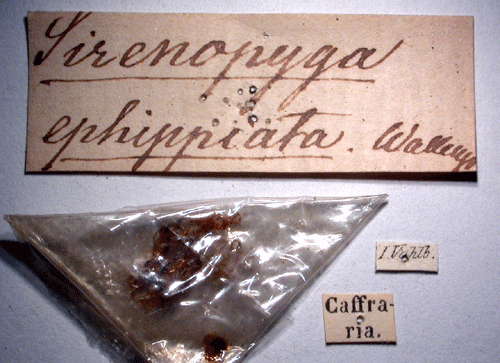 ![]() Sirenopyga ephippiata Wallengren, 1858. Reference: Wallengren, H.D.J. 1858, Nya Fjäril-slägten. - Öfversikt af Kongliga Vatenskaps-Akademiens Förhandllingar, femtonde årgången. pp 209-215, P. A. Norstedt & Söner, Stockholm. Return to species-list. |