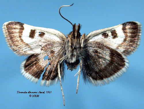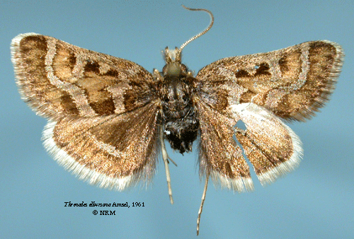 Threnodes elbursana Amsel, 1961. Reference: Amsel, H.G. 1961, Die Microlepidopteren der Brandt'schen Iran-Ausbeute 5. Teil. - Arkiv för Zoologi Band 13 nr. 17, Almqvist & Wiksells Boktryckeri AB, Uppsala. pp. 323-445 Mit 263 Abbildungen. Return to species-list. |