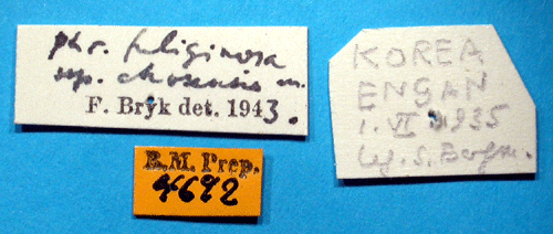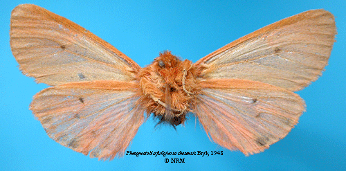 ![]() Phragmatobia fuliginosa chosensis Bryk, 1948. Reference: Bryk, F. 1948, Zur Kenntnis der Großschmetterlinge von Korea. Pars II. Macrofrenatae II (finis): Notodontidae, Lymantriidae, Saturniidae, Brahmaeidae, Drepanidae, Epiplemidae, Lasiocampidae, Arctiidae, Thyatiridae, Noctuidae, Geometridae. Heteroneura: Fam.: Cochlifiidae, Zygaenidae. Tineoidea: Fam.: Cossidae, Psychidae. Mit 7 Tafeln. - Arkiv för Zoologi Band 41 A nr. 1, Almqvist & Wiksell Boktryckeri, Uppsala. 1 - 225 pp. Return to species-list. |