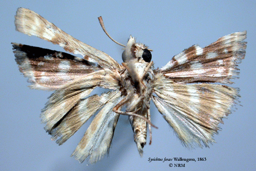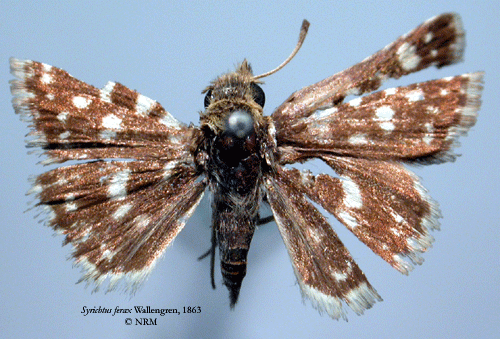 ![]() Syrichtus ferax Wallengren, 1863. Reference: Wallengren, H.D.J. 1863, Lepidopterologische Mittheilungen. - Wiener Entomologische Monatschrift Band VII Nr. 5, Karl Ueberreuter, Alservorstadt. pp 137-151. Return to species-list. |