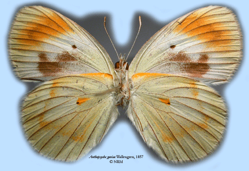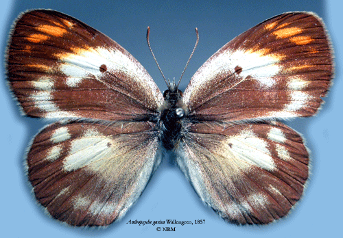 ![]() Anthopsyche gavisa Wallengren, 1857. Reference: Wallengren, H.D.J. 1857, Kafferlandets Dagfjärilar, insamlade åren 1838-1845 af J. A. Wahlberg. - Kongliga Vatenskaps-Akademiens Handllingar, ny följd, andra bandet fjärde häftet. pp 1-55, P. A. Norstedt & Söner, Stockholm. Return to species-list. |