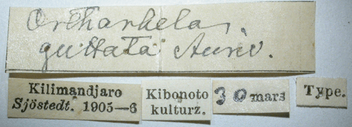 ![]() Ortharbela guttata Aurivillius, 1910. Reference: Aurivillius, Chr. 1910, in Sjöstedt, Y. Wissenschaftliche Ergebnisse der Swedischen Zoologischen Expedition nach dem Kilimandjaro, dem Meru und den Umgebenden Masaisteppen Deutsch-Ostafrikas 1905-1906 2 Band. - 9. Lepidoptera pp. 1-56, P. Palmquist AB., Stockholm. Return to species-list. |