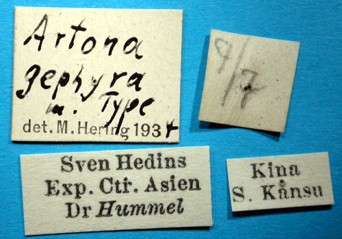 Reference: Hering, M. 1936, Swedish-chinesische wissenschaftliche Expedition nach den nordwestlichen Provinzen Chinas, unter Leitung von Dr. Sven Hedin und Prof. Sü Ping-chang. Insekten. gesammelt vom schwedischen Arzt der Expedition Dr. David Hummel 1927-1930. 40. Lepidoptera 4. Bombyces. - Arkiv för Zoologi Band 27 A nr. 32. Almqvist & Wiksells Boktryckeri AB, Uppsala. pp. 1-7.