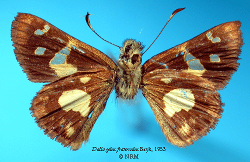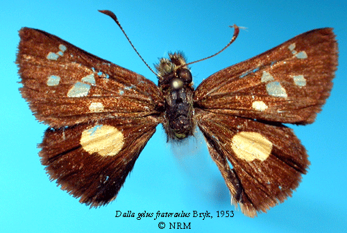 ![]() Dalla gelus fraterculus Bryk, 1953. Reference: Bryk, F. 1953, Lepidoptera aus dem Amazonasgebiete und aus Peru gesammelt von Dr. Douglas Melin und Dr. Abraham Roman. - Arkiv för Zoologi Band 5 nr. 1, Almqvist & Wiksell Boktryckeri, Uppsala. 268 pp. Return to species-list. |