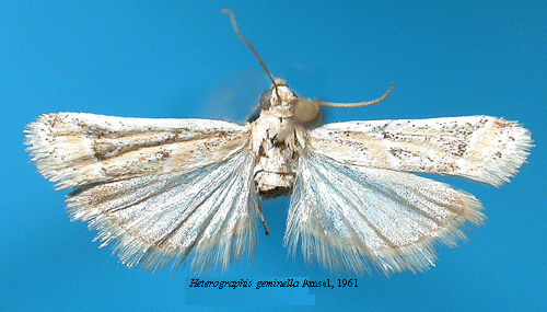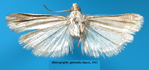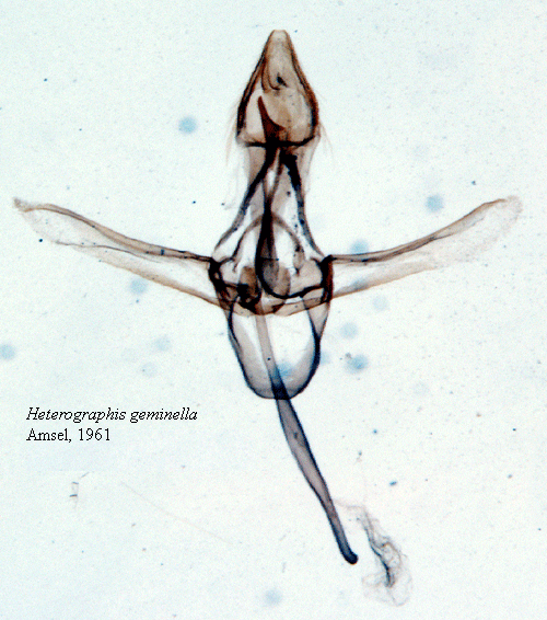 Heterographis geminella Amsel, 1961. Reference: Amsel, H.G. 1961, Die Microlepidopteren der Brandt'schen Iran-Ausbeute 5. Teil. - Arkiv för Zoologi Band 13 nr. 17, Almqvist & Wiksells Boktryckeri AB, Uppsala. pp. 323-445 Mit 263 Abbildungen. Return to species-list. |