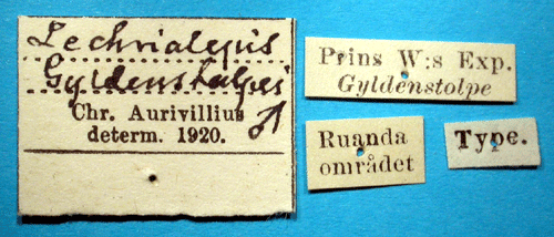 Lechriolepis gyldenstolpei Aurivillius, 1925. Reference: Aurivillius, C. 1925, Zoological Results of the Swedish Expedition to Central Africa 1921. Insecta 12. Lepidoptera. - Arkiv för Zoologi Band 17 A nr. 22, Almqvist & Wiksells Boktryckeri AB, Uppsala. pp. 1-20 Mit 5 Textfiguren. Return to species-list. |