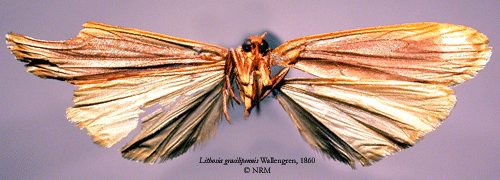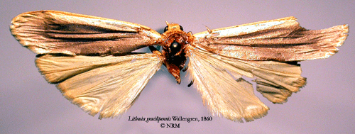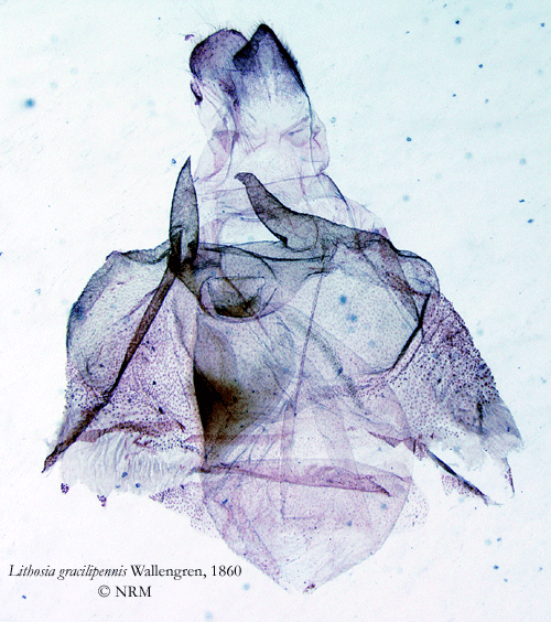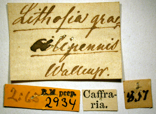 ![]() Lithosia gracilipennis Wallengren, 1860. Reference: Wallengren, H.D.J. 1860, Lepidopterologische Mittheilungen. - Wiener Entomologische Monatschrift Band IV Nr. 2, Karl Ueberreuter, Alservorstadt. pp 33-46. Return to species-list. |