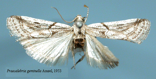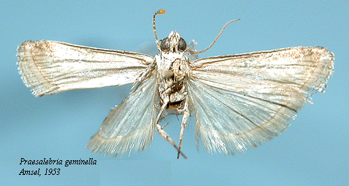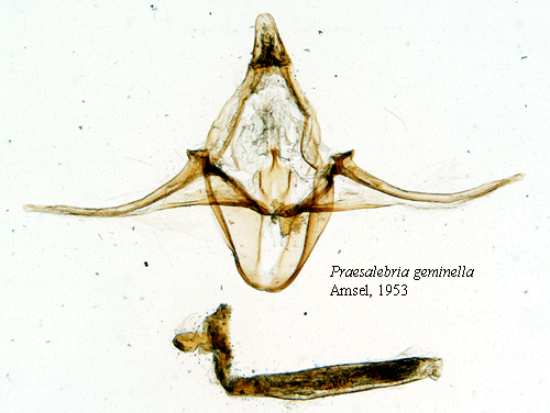 Praesalebria geminella Amsel, 1953. Reference: Amsel, H.G. 1953, Die Microlepidopteren der Brandt'schen Iran-Ausbeute 4. Teil. - Arkiv för Zoologi Band 6 nr. 16, Almqvist & Wiksells Boktryckeri AB, Uppsala. pp. 255-325 Mit 33 Tafeln. Return to species-list. |