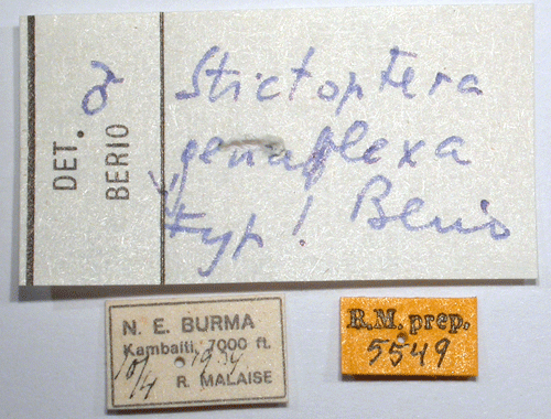 Stictoptera genuflexa Berio, 1973. Reference: Berio, E. 1973, Nuove specie e generi di Noctuidae Africane e Asiatiche e note sinonimiche, Parte II. - Annali del Museo Civico di Storia Naturale "Giacomo Doria" Vol. 79, Genova. pp. 126-171. Return to species-list. |