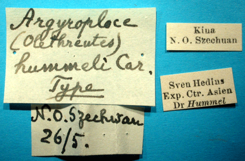 Reference: Caradja, A. 1934, Swedish-chinesische wissenschaftliche Expedition nach den nordwestlichen Provinzen Chinas, unter Leitung von Dr. Sven Hedin und Prof. Sü Ping-chang. Insekten. gesammelt vom schwedischen Arzt der Expedition Dr. David Hummel 1927-1930. 22.Lepidoptera 3. Familiae: Pyralidae, Pterophoridae, Tortricidae-Tineidae l. s. - Arkiv för Zoologi Band 27 A nr. 8. Almqvist & Wiksells Boktryckeri AB, Uppsala. pp. 1-10.