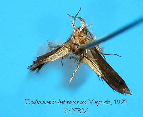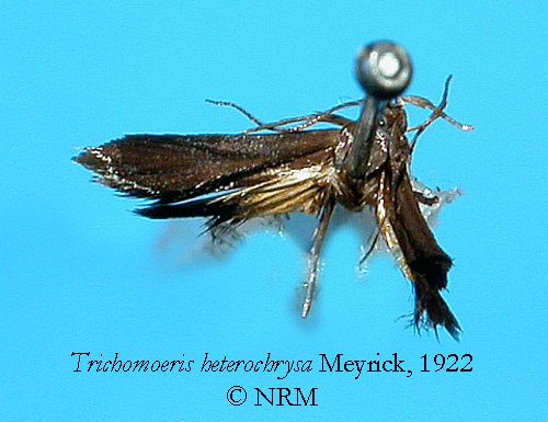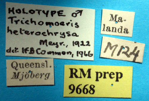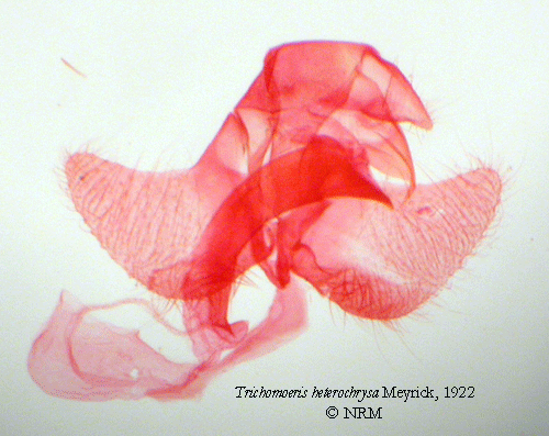 Trichomoeris heterochrysa Meyrick, 1922. Reference: Meyrick, Edw. 1922, Results of Dr. E. Mjöbergs Swedish Scientific Expedition to Australia 1910-1913. 27. Microlepidoptera. - Arkiv för Zoologi Band 14 nr. 15, Almqvist & Wiksells Boktryckeri AB, Uppsala. pp. 1-13. Return to species-list. |