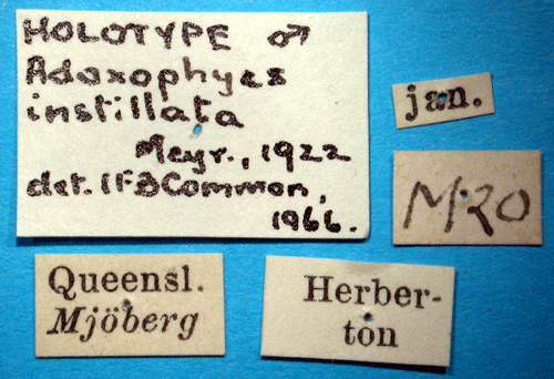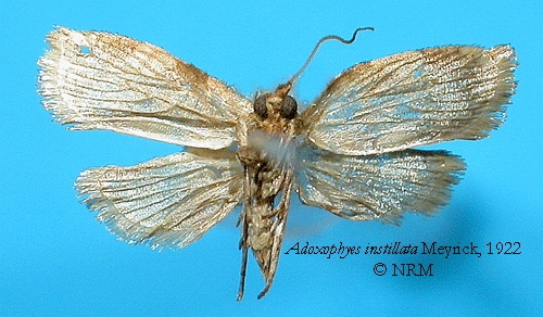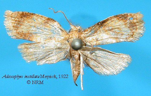 Adoxophyes instillata Meyrick, 1922. Reference: Meyrick, Edw. 1922, Results of Dr. E. Mjöbergs Swedish Scientific Expedition to Australia 1910-1913. 27. Microlepidoptera. - Arkiv för Zoologi Band 14 nr. 15, Almqvist & Wiksells Boktryckeri AB, Uppsala. pp. 1-13. Return to species-list. |