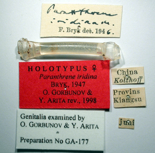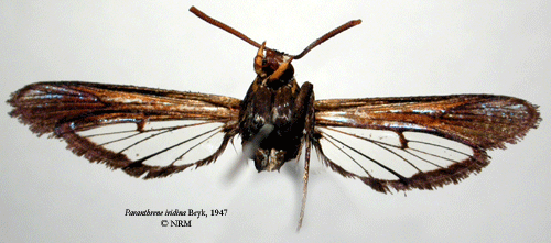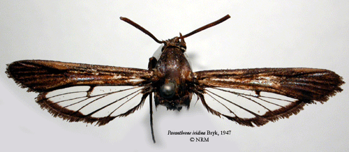 ![]() Paranthrene iridina Bryk, 1947. Reference: Bryk, F. 1947, Neue ostasiatiche Aegeriiden (Lep.). Mit einer Abbildung. - Opuscula Entomologica Band XII, Berlingska Boktryckeriet, Lund. 96 - 109 pp. Return to species-list. |