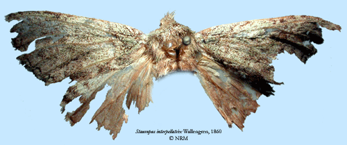 ![]() Stauropus interpellatrix Wallengren, 1860. Reference: Wallengren, H.D.J. 1860, Lepidopterologische Mittheilungen. - Wiener Entomologische Monatschrift Band IV Nr. 6, Karl Ueberreuter, Alservorstadt. pp 161-176. Return to species-list. |