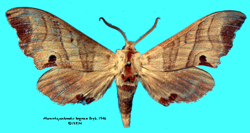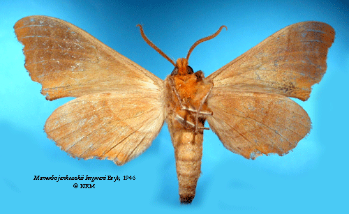 ![]() Marumba jankowskii bergmani Bryk, 1946. Reference: Bryk, F. 1946, Zur Kenntnis der Großschmetterlinge von Korea. Pars I. Rhopalocera, Hesperiodea et Macrofrenatae I Sphingidae. Mit 5 Tafeln und 1 Karte. - Arkiv för Zoologi Band 38 A nr. 3, Almqvist & Wiksell Boktryckeri, Uppsala. 1 - 74 pp. Return to species-list. |