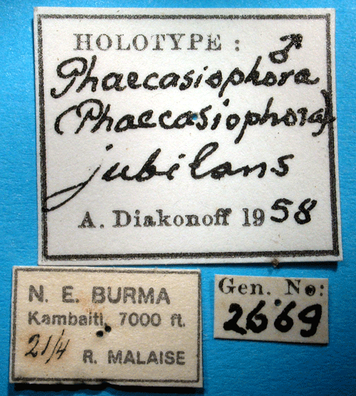 ![]() Phaecasiophora jubilans Diakonoff, 1959. Reference: Diakonoff, A. 1959, Entomological results from the Swedish Expedition 1934 to Burma and British India. Lepidoptera, Collected by René Malaise, Microlepidoptera II. With 7 plates and 6 figures in the text. - Arkiv för Zoologi Band 12 nr. 13, Almqvist & Wiksell Boktryckeri, Uppsala. 165 - 182 pp. Return to species-list. |