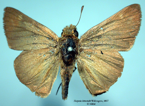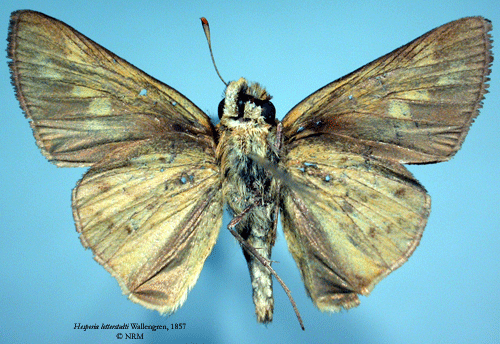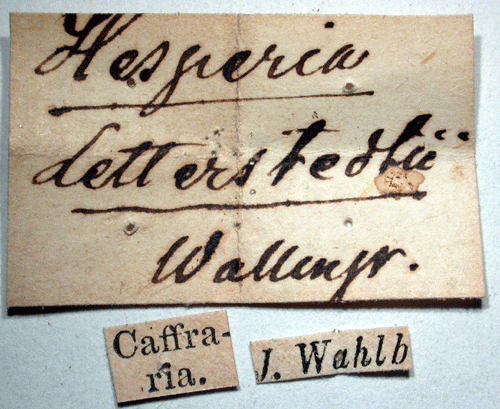 ![]() Hesperia letterstedti Wallengren, 1857. Reference: Wallengren, H.D.J. 1857, Kafferlandets Dagfjärilar, insamlade åren 1838-1845 af J. A. Wahlberg. - Kongliga Vatenskaps-Akademiens Handllingar, ny följd, andra bandet fjärde häftet. pp 1-55, P. A. Norstedt & Söner, Stockholm. Return to species-list. |