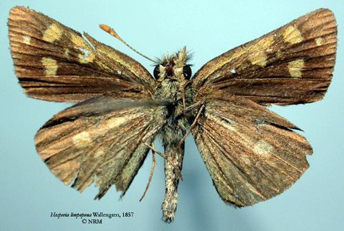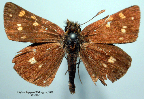 ![]() Hesperia limpopona Wallengren, 1857. Reference: Wallengren, H.D.J. 1857, Kafferlandets Dagfjärilar, insamlade åren 1838-1845 af J. A. Wahlberg. - Kongliga Vatenskaps-Akademiens Handllingar, ny följd, andra bandet fjärde häftet. pp 1-55, P. A. Norstedt & Söner, Stockholm. Return to species-list. |